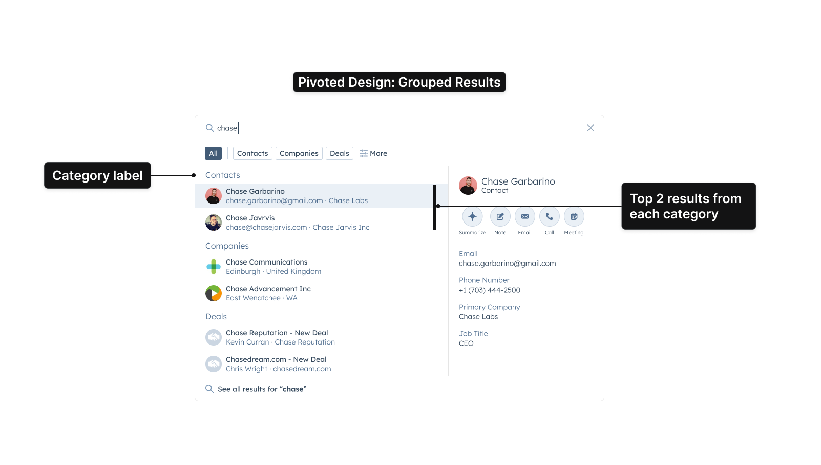 Following the initial launch, we continued to refine the experience. A key enhancement involved a visual refresh to align with HubSpot's updated design system, which included refined typography and updated iconography. We also shipped a significant interaction improvement by introducing progressive disclosure for the rich preview panel. The preview is now hidden by default and only appears when a user hovers over a specific result. This reduces initial cognitive load and provides detailed context exactly when the user signals interest.